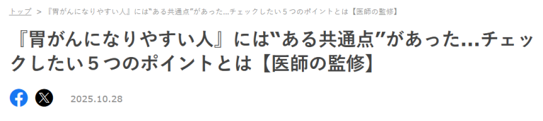 院長監修の記事が「TRILL」に掲載されました!『胃がんになりやすい人』の共通点です。 event_note2025.10.28 このたび、院長監修の記事が「TRILL」に掲載されました。 ぜひ記事をご覧いただき、多くの方にお役立ていただければ幸いです! 『胃がんになりやすい人』には“ある共通点”があった…チ...続きを読む