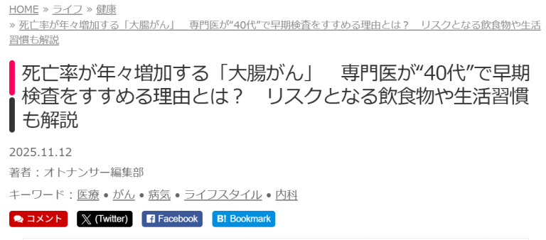 院長執筆の「大腸がん」の記事がYahoo!ニュースに掲載されました!(2025/11/12) event_note2025.11.13 このたび、院長が執筆した記事がYahoo!ニュースに掲載されました(掲載期間は1ヵ月となります)。ぜひご覧ください。 死亡率が年々増加する「大腸がん」 専門医が“40代”で早期検査...続きを読む