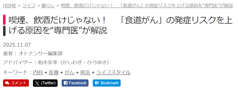 院長執筆の記事が「オトナンサー」に掲載されました!「食道がん」のリスクのお話です! event_note2025.11.12 このたび、院長が執筆した記事が「オトナンサー」に掲載されました。ぜひご覧ください。 喫煙、飲酒だけじゃない! 「食道がん」の発症リスクを上げる原因を“専門医”が解説 ...続きを読む