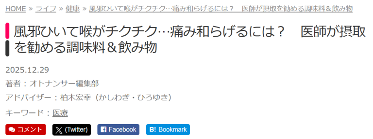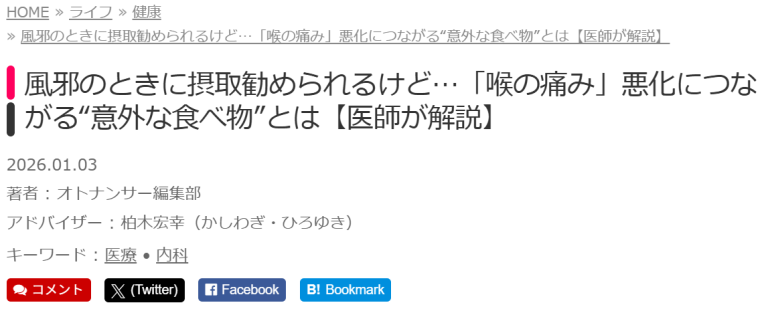 院長執筆の記事が「オトナンサー」に掲載されました!喉の痛みの悪化する食べものについてです! event_note2026.01.04 このたび、院長が執筆した記事が「オトナンサー」に掲載されました。ぜひご覧ください。 風邪のときに摂取勧められるけど…「喉の痛み」悪化につながる“意外な食べ物”とは【医師が解説】 |...続きを読む