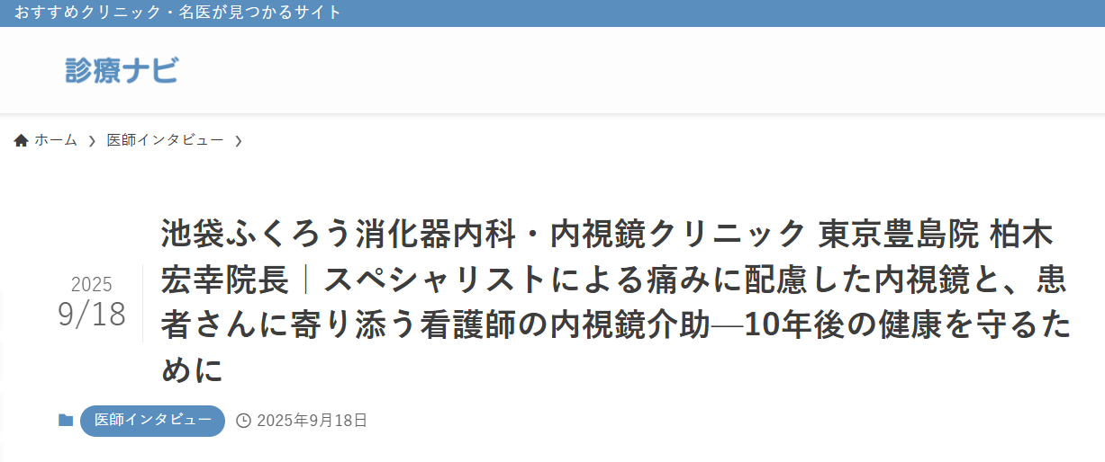 取材記事:池袋ふくろう消化器内科・内視鏡クリニック 東京豊島院 柏木 宏幸院長|スペシャリストによる痛みに配慮した内視鏡と、患者さんに寄り添う看護師の内視鏡介助—10年後の健康を守るために
