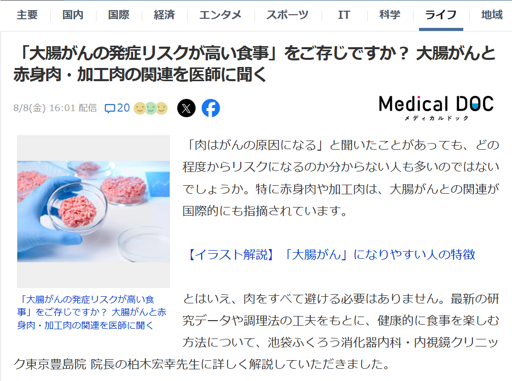 「大腸がんの発症リスクが高い食事」をご存じですか? 大腸がんと赤身肉・加工肉の関連を医師に聞く(メディカルドック) - Yahoo!ニュース
