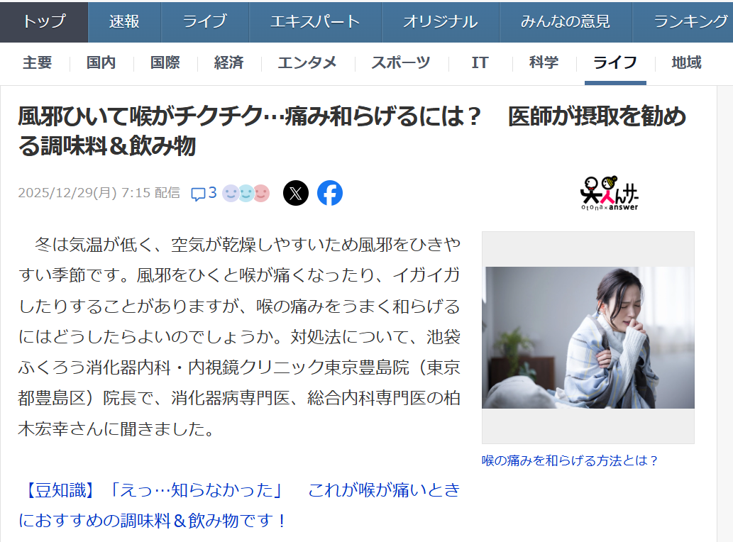 風邪ひいて喉がチクチク…痛み和らげるには? 医師が摂取を勧める調味料&飲み物(オトナンサー) - Yahoo!ニュース